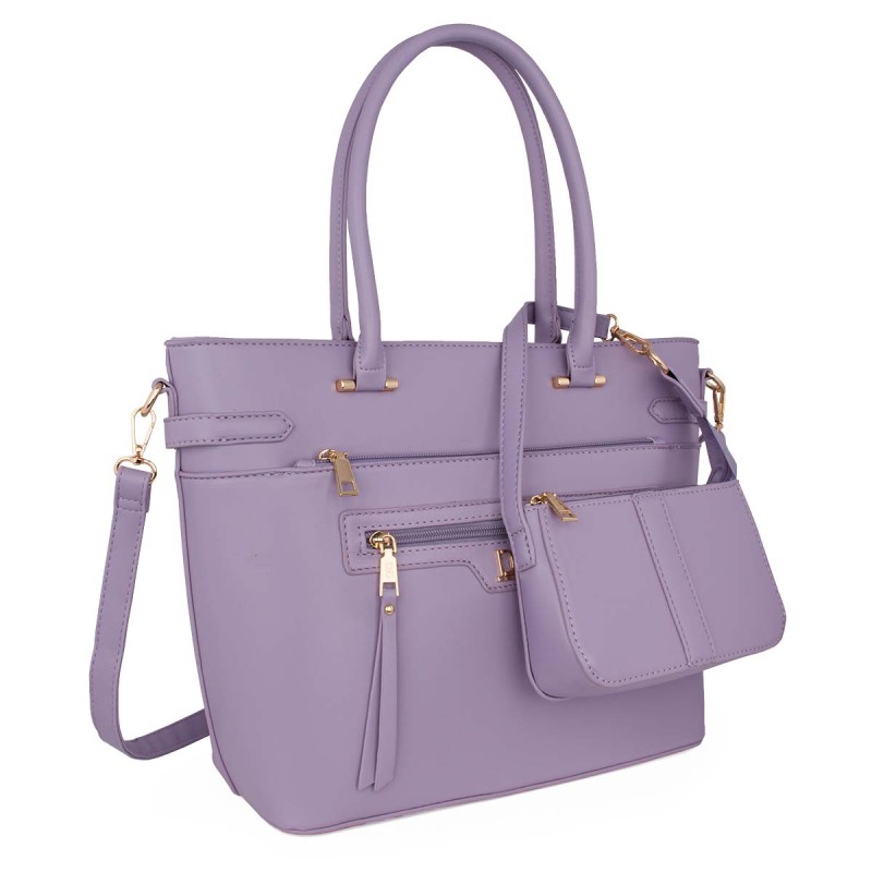 Women's shoulder bag purple. Eco-leather. It features 2 internal compartments, one with a zipper, and 2 external zippered pockets on the front. Adjustable, detachable crossbody strap. Extra detachable pouch with zipper. Dimensions: H 28cm, W 34cm, D 12cm. "Designed in Greece exclusively by De Raggi designers".